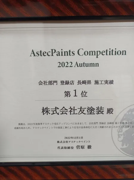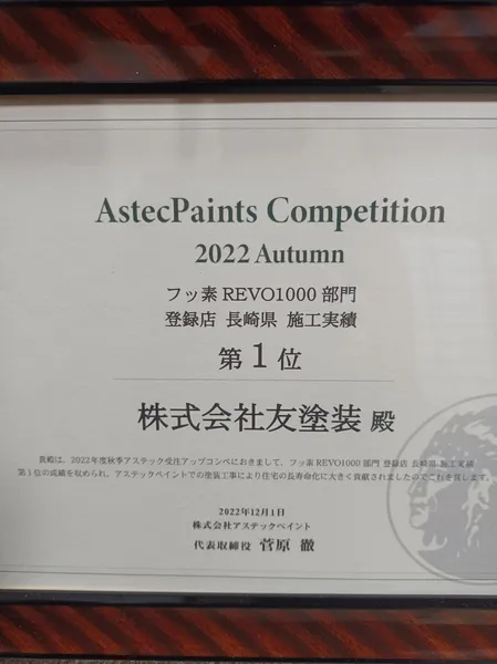 長崎県内で、3年連続アステックペイント施工実績第1位をいただいております。決して後悔をさせない塗装店として誠心誠意対応いたします。自社施工のため、最後までお客様に寄り添いますので、安心して施工をお任せください。